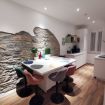 Il salotto con 2 divani a vista dalla cucina e dall'ingresso , e' separabile completamente in camera tramite pareti mobili composto da divano letto matrimoniale e da divano dormeuse con comodo letto singolo . La cucina con tavolo penisola completa di accessori ,stoviglie ed elettrodomestici incluso lavastoviglie .